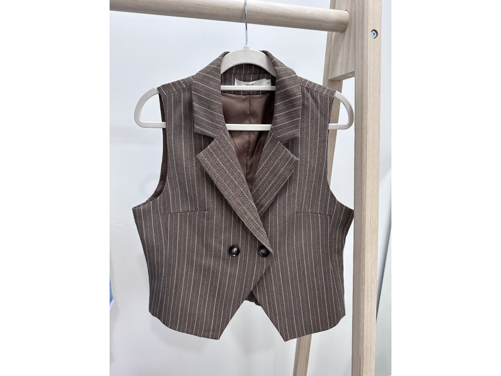 Vsaďte na nadčasovou eleganci a dokonalé detaily. Tato hnědá vestička s jemnými bílými proužky je ušita z kvalitního materiálu s příměsí hedvábí, který jí dodává luxusní vzhled. Zapínání na knoflíčky působí minimalisticky a sofistikovaně. Skvěle se hodí k bílé košili, saténové halence nebo jen tak, jako samostatný kousek. Velikosti odpovídají. Foceno na velikosti S a výšce 173cm.