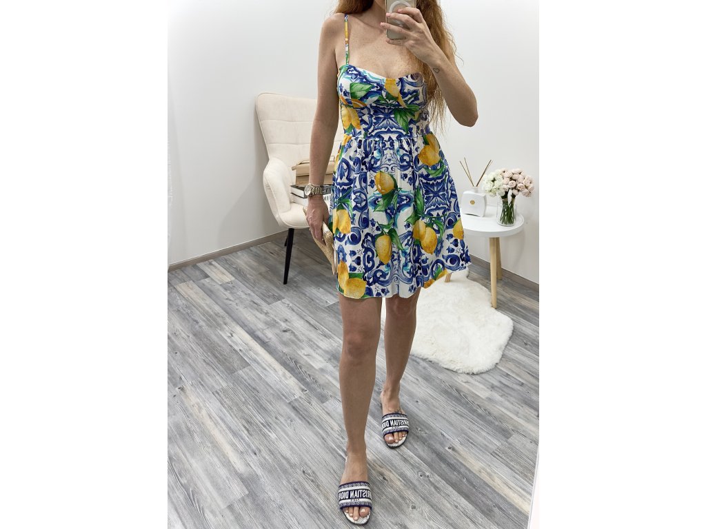 Pro letní dny strávené na dovolené. Přesně pro tohle se hodí tyhle šaty na tenká ramínka, které v sobě spojují lehkost letních dnů. Vzdušná sukně krásně splývá při každém kroku a výztuž v oblasti prsou ti dodá pocit jistoty i bez podprsenky. Výrazný motiv citronků a modrých vzorů evokuje středomořské léto – svěží, zářivé a plné radosti. Ideální na procházku, letní večer s přáteli nebo dovolenou, kterou nechceš zapomenout. Velikost je UNI - sedí na XS, S, M, L. Foceno na velikosti S a výšce 173cm.
